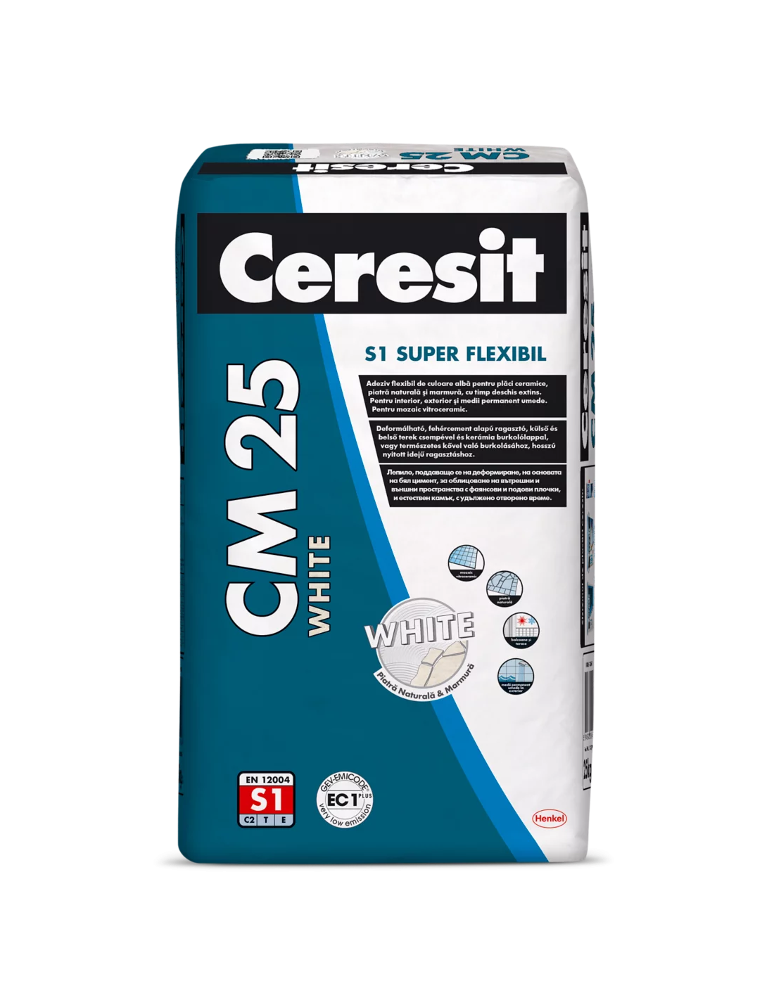 Adezivul Ceresit CM 25 este un adeziv flexibil, de culoare albă, pentru placări ceramice, mozaicuri și placări din piatră naturală, pe suprafețe critice și în spații permanent umede. Acesta se poate utiliza atât la interior, cât și la exterior. Ceresit CM 25 este un adeziv flexibil care este destinat și utilizării pentru placările din marmură și plăci de gips carton.