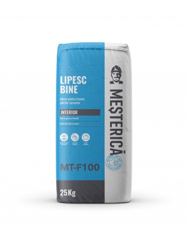 Adeziv Mesterica Lipesc Bine (MT F100) pentru montarea de gresie și faianță este un produs care se poate utiliza atât la interior, cât și la exterior. Se poate utiliza pentru a lipi orice tip de gresie, gresie porțelanată, faianță, piatră naturală rezistentă la patare și mozaic. Este recomandat pentru utilizarea pe suporturi cu aderență la mortare pe bază de ciment. Nu se recomanda utilizarea pe suporturi din metal, lemn sau plastic. Acest tip de adeziv este pe bază de lianți minerali și se încadrează la Clasa C1.