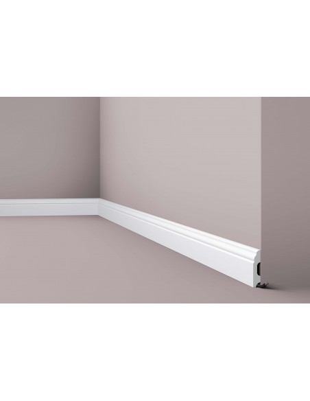 Plinta FB1 este un profil decorativ confecționat din polimer dur, viguros la umezeală și șocuri. Oferă grație locuinței prin stilul elegant și minimalist, fiind potrivit pentru amenajările contemporane. Este potrivit pentru mascarea cablurilor sau a unor defecte de finisare.