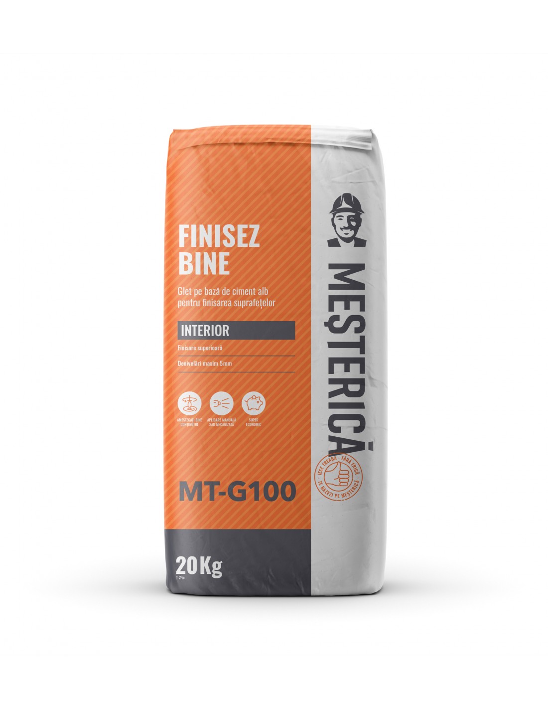 Mesterica Finisez bine este un glet pentru interior pe bază de ciment alb. Mesterica Finisez bine se aplică pentru finisarea suprafețelor interioare tencuite cu tencuieli pe bază de ciment sau ciment/var. Nu se aplica peste var sau huma, pe suporturi din ipsos, lemn, metal sau plastic.