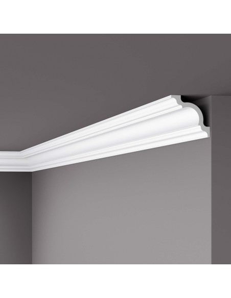 Cornișă decorativă A1, confecționată din polistiren extrudat este un profil decorativ de culoare alb mat, este pus în valoare prin designul său simetric. Se potrivește în cadrul unor amenajări de tip clasic, romantic sau baroc venețian. Prin designul său unic, este perfect pentru a ascunde imperfecțiunile de finisare.