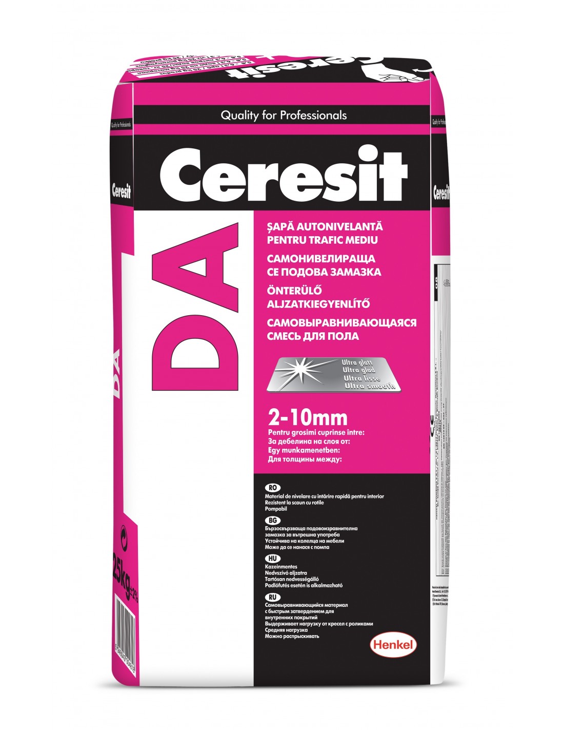 Ceresit DA este o șapă autonivelantă destinată traficului pentru trafic mediu. Ceresit DA este destinată nivelării suprafețelor pe bază de ciment. Se aplica în straturi de până la 10 mm în vederea obținerii unei suprafețe perfect plane anterior acoperirii cu mocheta, parchet laminat, PVC, linoleum sau plăci ceramice. Acesta este un produs ce se aplică doar la interior.