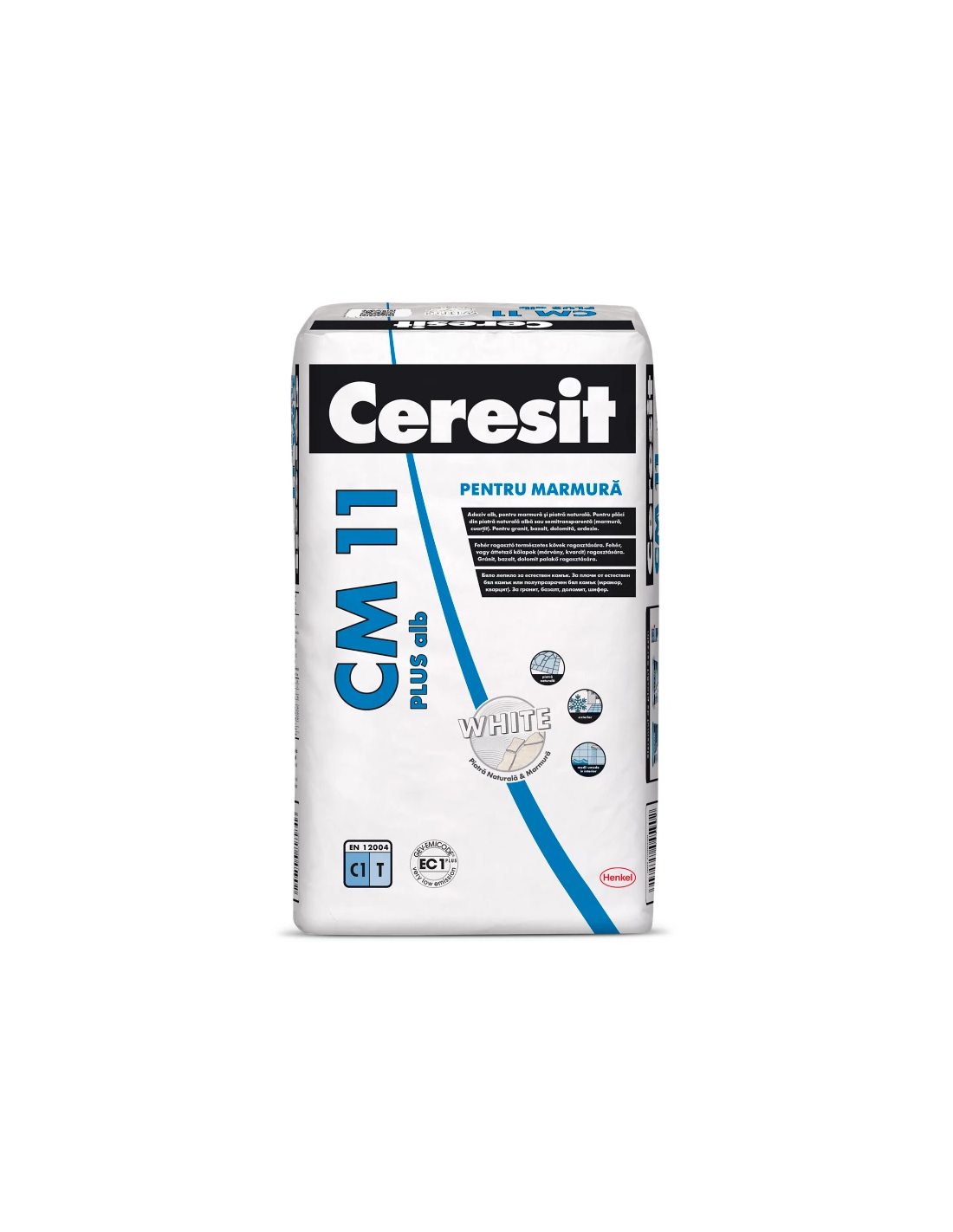 Adezivul Ceresit CM 11 Plus Alb este destinat pentru lipirea pietrei naturale sensibile la patare, a pietrei naturale de culoare alba și semitransparentă, a plăcilor ceramice de gresie, gresie porțelanată și faianță, mozaicurilor și teracotelor. Este recomandat pentru placarea pereților și a pardoselii atât din interiorul clădirilor, cât și din exteriorul acestora precum: bucătării, băi, fațadă, în domeniul casnic, birouri și spații publice. Adezivul este format dintr-o combinație de ciment cu compuși naturali și modificatori. Acesta se clasează în Clasa C1T.